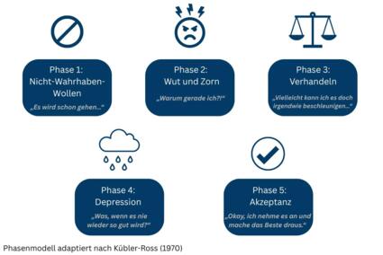 Jede Verletzung ist anders und jeder Athlet verarbeitet sie individuell. Dennoch gibt es häufige emotionale Muster, die viele Betroffene durchlaufen. Ein weit verbreitetes Modell zur Verarbeitung von Verlusten ist das Phasenmodell nach Kübler-Ross (1970). Auch wenn es ursprünglich für Trauerprozesse entwickelt wurde, lässt es sich gut auf den Umgang mit Verletzungen übertragen. Die Phasen verlaufen nicht linear – manche Athleten durchlaufen sie schneller, andere langsamer, und oft springt man zwischen ihnen hin und her. Auch kann es vorkommen, dass Sportler sehr schnell in den Funktionsmodus übergehen und emotionale Reaktionen erst einmal vermieden werden. Es ist dann gut, ihnen im Verlauf in einem sicheren Kontext Raum zu geben, da Gefühle ja auch ein großer Motor für Verarbeitungsprozesse und Veränderungen sein können.